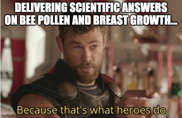 I’m honestly surprised that the NYP didn’t just say they interviewed a man in a pinstripe suit and quoted him to say, “AWOOOGA!!!” while his eyes bugged out of his head. But I digress. Clearly the NYP gave up early on providing an evidence-based answer to a question for boob enthusiasts worldwide, so, I took it upon myself to explain more on bee pollen, and try to substantiate some of the claims and curiosities surrounding its chemical properties and their effects on women.