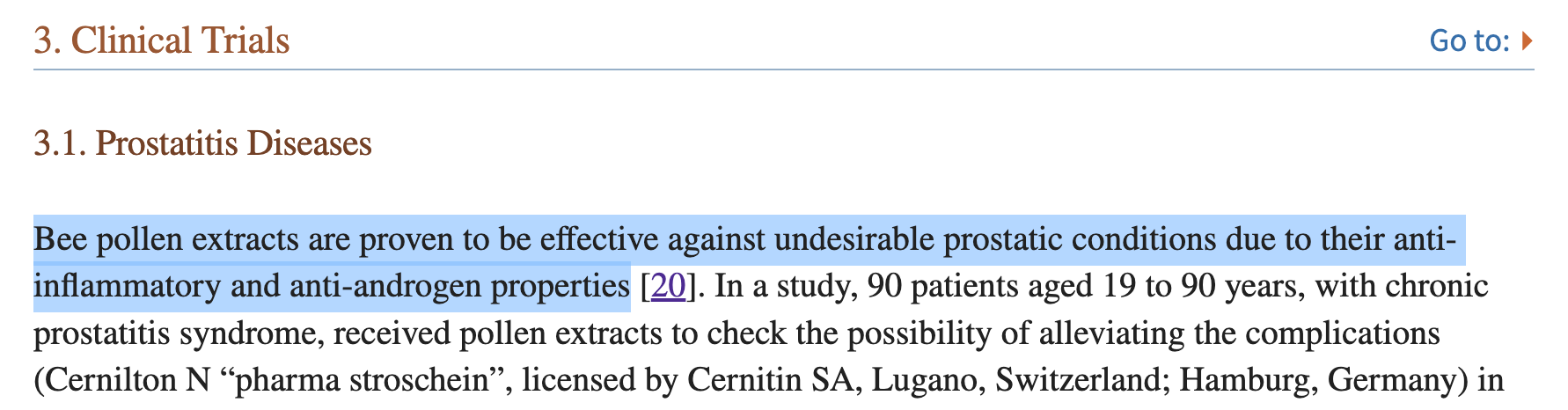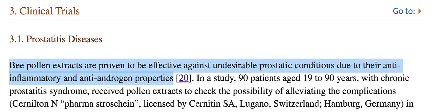 As you can see, the first study reported in this review claims that bee pollen treats prostatitis. When you look up the actual study, it didn’t even use bee pollen. It used Cernilton, an extract created from a pollen produced by a specific type of ryegrass in Europe. Besides the fact that the general state of evidence on this extract is limited and addresses symptoms rather than treating the disease, this is not bee pollen! I read through the rest of the review of literature, and every citation is fairly similar in how it inaccurately presents the data.